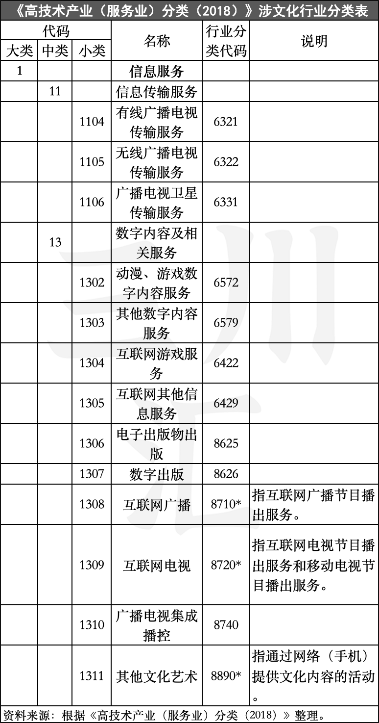 该分类主要以应用高技术手段为社会提供服务活动为参照,共包括信息服务、电子商务服务、检验检测服务、专业技术服务业的高技术服务、研发与设计服务、科技成果转化服务、知识产权及相关法律服务、环境监测及治理服务和其他高技术服务等9大类,以及25个中类97个小类。其中,涉及文化、广电和传媒领域涵盖1个大类2个中类14个小类(并非全部)。