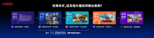 这支视频基于MiracleVision(美图奇想大模型)的图像生成、视频生成能力。具体来说,它使用了开拍的“AI脚本”、“AI数字人”功能,WHEE的“文生图”、“AI生视频”功能,Wink的“视频编辑”功能,仅用半天就完成了故事脚本、分镜设计、视频生成、唇形同步、视频编辑等视频制作流程。